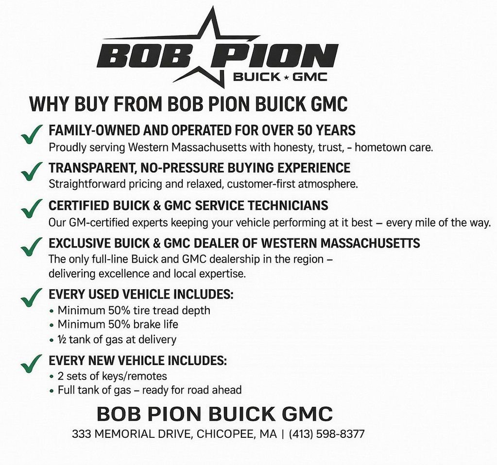 DO NOT WAIT MAKE YOUR MOVE TODAY! DEALS LIKE THIS WILL NOT LAST LONG. VISIT US NOW OR CALL TO RESERVE YOUR VIP TEST DRIVE BEFORE SOMEONE ELSE DOES! Proud to be your 7X CARFAX Dealer of the Year (2019 2025)! Shop with confidence knowing every pre-owned vehicle receives: ? 172-Point Safety Inspection ? Brand-new oil & filters ? New wiper blades ? Tires & brakes with at least 50% life remaining Disclaimer: Tax, Title & Doc Fees not included. Free Home Delivery up to 100 miles! While we work hard to ensure website accuracy, mistakes may occur. Please call 413-598-8377 to verify all details or stop by and see why our customers trust Bob Pion Buick GMC.
