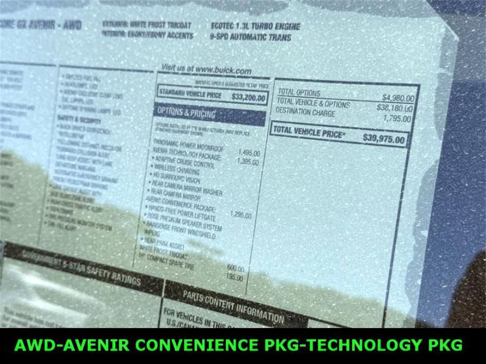 AWD-Avenir Convenience Package-Avenir Technology PackageBob Pion Buick GMC is proud to present you with another True Market Priced Vehicle. This 2026 Buick Encore GX Avenir is loaded with the following Factory Options: Avenir Convenience Package (Bose Premium 7-Speaker Audio System, Front Intermittent Rainsense Wipers, Hands Free Power Liftgate, and Rear Park Assist), Avenir Technology Package (Adaptive Cruise Control, HD Surround Vision, Rear Camera Mirror, Rear Camera Mirror Washer, and Wireless Charging), Preferred Equipment Group 1SL, Encore GX Avenir, 4D Sport Utility, ECOTEC 1.3L Turbo, 9-Speed Automatic, AWD, White Frost Tricoat, and Ebony Seats With Ebony Interior Accents Leather Avenir Convenience Package (Bose Premium 7-Speaker Audio System, Front Intermittent Rainsense Wipers, Hands Free Power Liftgate, and Rear Park Assist), Avenir Technology Package (Adaptive Cruise Control, HD Surround Vision, Rear Camera Mirror, Rear Camera Mirror Washer, and Wireless Charging), Preferred Equipment Group 1SL, Encore GX Avenir, 4D Sport Utility, ECOTEC 1.3L Turbo, 9-Speed Automatic, AWD, White Frost Tricoat, Ebony Seats With Ebony Interior Accents Leather, 2-Way Front Passenger Power Lumbar, 2-Way Power Driver Lumbar Control, 3.17 Final Drive Axle Ratio, 4-Wheel Disc Brakes, 6-Way Power Front Passenger Seat Adjuster, 7 Speakers, 8-Way Power Driver Seat Adjuster, ABS brakes, Air Conditioning, Alloy wheels, AM/FM radio: SiriusXM, Auto High-beam Headlights, Auto-dimming Rear-View mirror, Automatic temperature control, Brake assist, Bumpers: body-color, Compass, Delay-off headlights, Driver door bin, Driver vanity mirror, Dual front impact airbags, Dual front side impact airbags, Electronic Stability Control, Emergency communication system: OnStar and Buick connected services capable, Enhanced Performance 7-Speaker System w/Amplifier, Front anti-roll bar, Front Bucket Seats, Front Center Armrest, Front dual zone A/C, Front License Plate Bracket, Front reading lights, Front wheel independent suspension, Fully automatic headlights, Garage door transmitter, Heated door mirrors, Heated Driver & Front Passenger Seats, Heated front seats, Heated steering wheel, Illuminated entry, Knee airbag, Low tire pressure warning, Mechanical Jack w/Tools, Memory seat, Occupant sensing airbag, Outside temperature display, Overhead airbag, Overhead console, Panic alarm, Passenger door bin, Passenger vanity mirror, Perforated Leather-Appointed Seat Trim, Power door mirrors, Power driver seat, Power Panoramic Tilt-Sliding Moonroof, Power passenger seat, Power steering, Power windows, Radio data system, Radio: AM/FM Audio System, Rear reading lights, Rear seat center armrest, Rear side impact airbag, Rear window defroster, Rear window wiper, Remote keyless entry, Ride & Handling Suspension, Security system, SiriusXM Trial Subscription, Speed control, Speed-sensing steering, Split folding rear seat, Spoiler, Steering wheel mounted audio controls, Tachometer, Telescoping steering wheel, Tilt steering wheel, Traction control, Trip computer, Variably intermittent wipers, Wheels: 19 Avenir Premium Pearl Nickel Aluminum, and Wireless Apple CarPlay/Wireless Android Auto!!