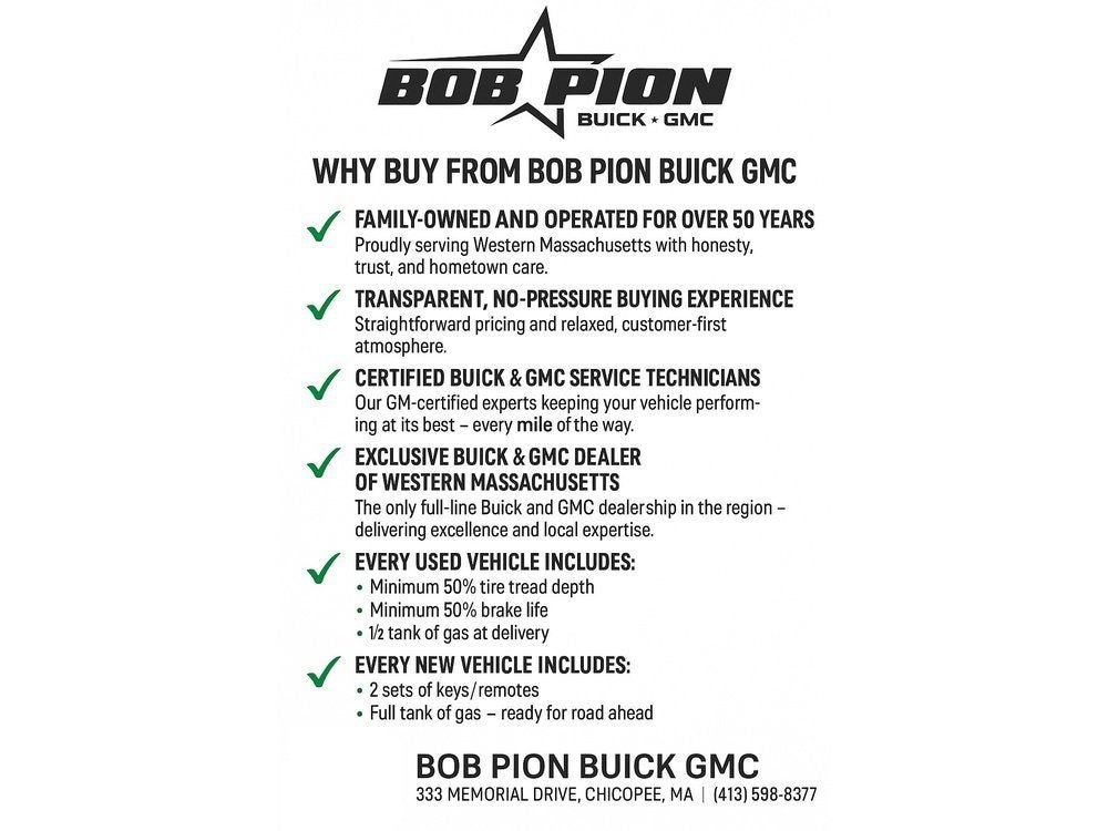 AWD-Avenir Pkg-Sunroof-Leather-Heated/Ventilated Seats-Heated Steering Wheel-Remote Start-Backup Camera-Bluetooth-Fully LoadedDO NOT WAIT MAKE YOUR MOVE TODAY! DEALS LIKE THIS WILL NOT LAST LONG. VISIT US NOW OR CALL TO RESERVE YOUR VIP TEST DRIVE BEFORE SOMEONE ELSE DOES! Proud to be your 7X CARFAX Dealer of the Year (2019 2025)! Shop with confidence knowing every pre-owned vehicle receives: ? Full Tank of Gas ? 2 Sets of Keys/Remotes Disclaimer: Tax, Title & Doc Fees not included. Free Home Delivery up to 100 miles! While we work hard to ensure website accuracy, mistakes may occur. Please call 413-598-8377 to verify all details or stop by and see why our customers trust Bob Pion Buick GMC.For over 40 years, thousands of our customers have trusted us in guiding them with their vehicle purchase and have been thoroughly satisfied with how we've assisted them in their car buying experience! Here are just a few of the reasons they trust and choose Bob Pion Buick GMC: We're here to help you buy a car, not to sell you one. Our staff first takes the time to understand your vehicle needs and wants, then works with you to find the right vehicle Over 100 years of automotive repair experience makes up our service department that will help you keep your vehicle on the road for years to come Once we've helped you find the right vehicle, we make getting the best deal quick and easy. You won't have to spend your day going back and forth with the manager a dozen times to get our best price. Recent Arrival!2026 Buick Envision Avenir