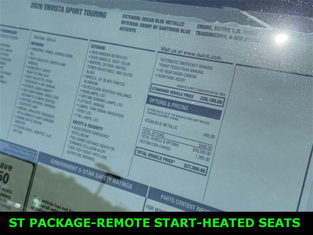 Bob Pion Buick GMC is proud to present you with another True Market Priced Vehicle. This 2026 Buick Envista Sport Touring is loaded with the following Factory Options: Preferred Equipment Group G03, Envista Sport Touring, 4D Sport Utility, ECOTEC 1.2L Turbo, 6-Speed Automatic, FWD, Ocean Blue Metallic, and Ebony Seats Interior With Santorini Blue Stitc Premium Synthetic Preferred Equipment Group G03, Envista Sport Touring, 4D Sport Utility, ECOTEC 1.2L Turbo, 6-Speed Automatic, FWD, Ocean Blue Metallic, Ebony Seats Interior With Santorini Blue Stitc Premium Synthetic, 2 USB Ports (1 Type-A, 1 Type-C), 3.50 Final Drive Axle Ratio, 4-Way Manual Front Passenger Seat Adjuster, 4-Wheel Disc Brakes, 6 Speakers, 6-Way Manual Driver Seat Adjuster, ABS brakes, Air Conditioning, Alloy wheels, AM/FM radio: SiriusXM, Auto High-beam Headlights, Automatic temperature control, Brake assist, Bumpers: body-color, Compass, Delay-off headlights, Driver door bin, Driver vanity mirror, Dual front impact airbags, Dual front side impact airbags, Electronic Stability Control, Emergency communication system: OnStar, Exterior Parking Camera Rear, Front anti-roll bar, Front Bucket Seats, Front Center Armrest, Front License Plate Bracket, Front reading lights, Front wheel independent suspension, Fully automatic headlights, Heated door mirrors, Illuminated entry, Leatherette Seat Trim, Low tire pressure warning, Occupant sensing airbag, Outside temperature display, Overhead airbag, Overhead console, Panic alarm, Passenger door bin, Passenger vanity mirror, Power door mirrors, Power steering, Power windows, Premium 6-Speaker Audio System Feature, Radio data system, Radio: AM/FM Stereo Audio System, Rear Parking Sensors, Rear window defroster, Remote keyless entry, Security system, SiriusXM Trial Subscription, Speed control, Split folding rear seat, Steering wheel mounted audio controls, Tachometer, Telescoping steering wheel, Tilt steering wheel, Traction control, Trip computer, Turn signal indicator mirrors, Variably intermittent wipers, Wheels: 18 Black Painted Aluminum, and Wireless Apple CarPlay/Wireless Android Auto!!