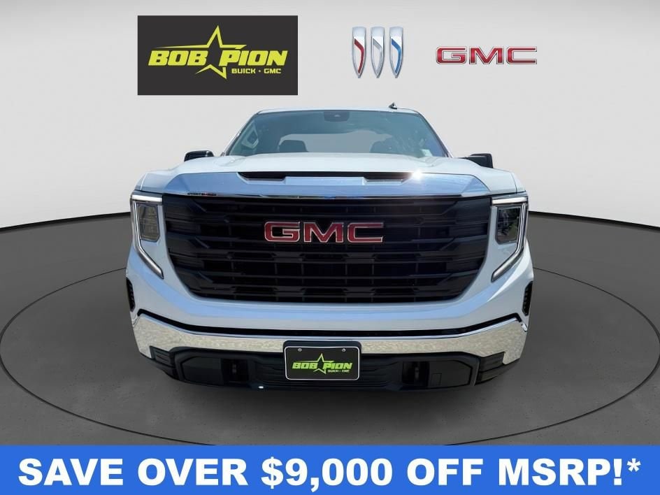 Bob Pion Buick GMC is proud to present you with another True Market Priced Vehicle. This 2025 GMC Sierra 1500 Pro is loaded with the following Factory Options: Convenience Package (Deep-Tinted Glass, Electric Rear-Window Defogger, EZ Lift Power Lock & Release Tailgate, and LED Cargo Area Lighting), Preferred Equipment Group 1SA (2 Charge/Data USB Ports, 220 Amp Alternator, Chrome Header w/Flat Black Grille Insert Bars, Front Frame-Mounted Black Recovery Hooks, HD Rear Vision Camera, OnStar Services Capable, Power Door Locks, Power Front Windows w/Driver Express Up/Down, Power Front Windows w/Passenger Express Down, Push Button Start, Remote Keyless Entry, Solar Absorbing Tinted Glass, and Wi-Fi Hotspot Capable), Pro Value Package, Snow Plow Prep Package (Heavy-Duty Air Filter), Standard Suspension Package, Trailering Package (Hitch Guidance), Sierra 1500 Pro, 2D Standard Cab, EcoTec3 5.3L V8, 10-Speed Automatic, 4WD, Summit White, and Jet Black Vinyl Convenience Package (Deep-Tinted Glass, Electric Rear-Window Defogger, EZ Lift Power Lock & Release Tailgate, and LED Cargo Area Lighting), Preferred Equipment Group 1SA (2 Charge/Data USB Ports, 220 Amp Alternator, Chrome Header w/Flat Black Grille Insert Bars, Front Frame-Mounted Black Recovery Hooks, HD Rear Vision Camera, OnStar Services Capable, Power Door Locks, Power Front Windows w/Driver Express Up/Down, Power Front Windows w/Passenger Express Down, Push Button Start, Remote Keyless Entry, Solar Absorbing Tinted Glass, and Wi-Fi Hotspot Capable), Pro Value Package, Snow Plow Prep Package (Heavy-Duty Air Filter), Standard Suspension Package, Trailering Package (Hitch Guidance), Sierra 1500 Pro, 2D Standard Cab, EcoTec3 5.3L V8, 10-Speed Automatic, 4WD, Summit White, Jet Black Vinyl, 120-Volt Bed Mounted Power Outlet, 120-Volt Interior Power Outlet, 2 Speakers, 2-Speaker Audio System Feature, 3.23 Rear Axle Ratio, 3.42 Rear Axle Ratio, 4-Way Manual Driver Seat Adjuster, 4-Way Manual Passenger Seat Adjuster, 4-Wheel Disc Brakes, ABS brakes, Air Conditioning, AM/FM radio, Apple CarPlay/Android Auto, Auto High-beam Headlights, Auto-Locking Rear Differential, Automatic Emergency Braking, Auxiliary External Transmission Oil Cooler, Brake assist, Buckle to Drive, Bumpers: chrome, Compass, Delay-off headlights, Driver door bin, Dual front impact airbags, Dual front side impact airbags, Electronic Stability Control, Emergency communication system: OnStar, External Engine Oil Cooling, Following Distance Indicator, Forward Collision Alert, Front 40/20/40 Split-Bench Seat, Front anti-roll bar, Front Center Armrest w/Storage, Front License Plate Kit, Front Pedestrian Braking, Front reading lights, Front wheel independent suspension, Fully automatic headlights, Heated door mirrors, Illuminated entry, Integrated Trailer Brake Controller, IntelliBeam Automatic High Beam On/Off, Lane Keep Assist w/Lane Departure Warning, Low tire pressure warning, Occupant sensing airbag, Outside temperature display, Overhead airbag, Overhead console, Panic alarm, Passenger door bin, Passenger vanity mirror, Power door mirrors, Power steering, Power windows, Radio data system, Radio: GMC Infotainment Audio System, Rear reading lights, Rear step bumper, Remote keyless entry, Speed control, Speed-sensing steering, Tachometer, Tilt steering wheel, Traction control, Trip computer, Variably intermittent wipers, Vinyl Seat Trim, Voltmeter, Wheels: 17 x 8 Silver Painted Steel, and Wireless Apple CarPlay/Wireless Android Auto!!